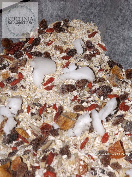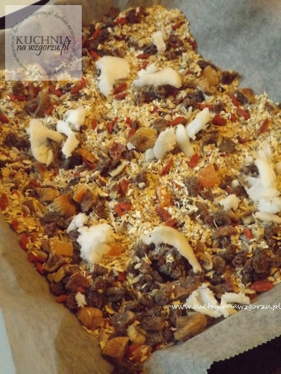 Owoce ( oprócz rodzynek i owoców goi ) pokroić na drobne kawałeczki, wymieszać z otrębami. Wysypać wszystko na formę do pieczenia, wyłożoną papierem i z góry położyć kilka łyżek oleju kokosowego. Wstawić do piekarnika nagrzanego do 160 C i piec przez około 20-25 minut, sprawdzać i mieszać co jakiś czas.
