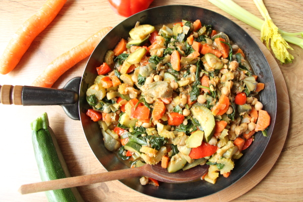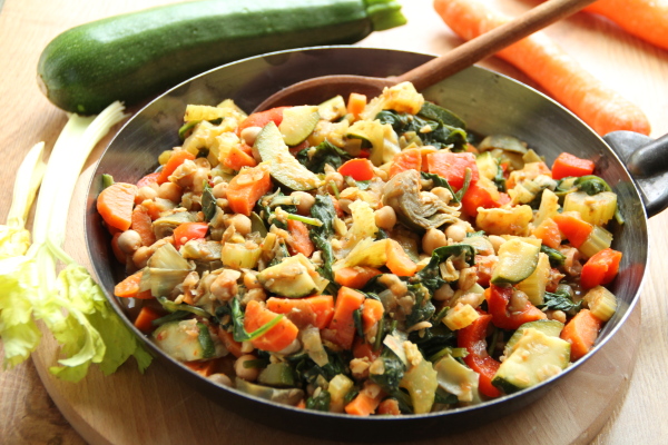 Na głębokiej patelni rozgrzej oliwę, wrzuć cebulkę i czosnek, papryczkę chilli i zeszklij. Dodaj curry, kurkumę i kolendrę. Wymieszaj. Następnie dodaj pokrojoną marchew, karczochy i paprykę. Przesmaż przez4-5 minut. Następnie dodaj seler naciowy i zmiksowane pomidory. Po ok. 5 minutach dodaj cukinię, por i ciecierzycę. Duś całość na małym ogniu mieszając od czasu do czasu. Po ok. 10 minutach dodaj liście szpinaku. Wymieszaj dokładnie i duś jeszcze przez 2 minuty.
