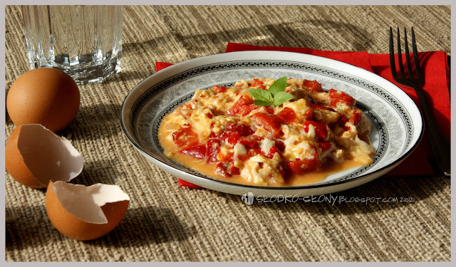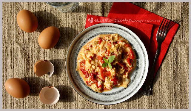Rano wybiegłam z domu bez śniadania. Miałam spotkanie w centrum Warszawy i bałam się, że się spóźnię. Jednak wielkomiejski ruch samochodowy był dla mnie łaskawy i nie tylko zdążyłam na czas, ale nawet mogłam wybierać w miejscach do zaparkowania. W kawiarni siedziałam na miękkiej kanapie, przy drewnianym stoliku, przy wielkim oknie wychodzącym na ulicę, z filiżanką cappuccino w dłoniach i przeglądałam kolejne kartki z projektem. Za szybą przechodzili ludzie, spiesząc się w różnych kierunkach. Zaczęło mi burczeć w brzuchu, a moje myśli zaczęły krążyć wokół wymarzonego śniadania. A dokładniej jajecznicy. Ale nie takiej zwykłej. Jajecznicy z pieczoną papryką, którą darzę uwielbieniem wciąż i na nowo. To jajecznica, którą się je w słoneczny niedzielny poranek, w ciepłej, miękkiej pościeli, podaną na drewnianej tacy z białą filiżanką wypełnioną parującą kawą i małym wazonikiem z żywym kwiatkiem (za wazonik mogłaby służyć szklanka). Nagle tuż za oknem pojawił się kurier z wózkiem pełnym paczek, wysokością dorównującym wzrostowi jego samego i wyrwał mnie z marzeń o idealnym śniadaniu. Wróciłam więc do projektu, już letniego cappuccino i małego kruchego cantuccini, które stanowiło mój pierwszy posiłek tego listopadowego dnia.