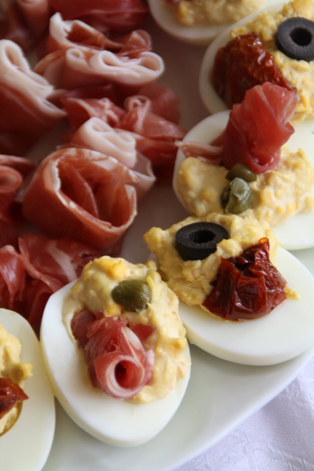 1. Z przekrojonych jajek wyjęłam żółtka. Wymieszałam je z odrobiną oliwy z pomidorów, łyżką majonezu i startym serem grana padano, doprawiłam do smaku. Wyłożyłam farsz na białka i dodałam czarne oliwki i kawałki suszonych pomidorów.