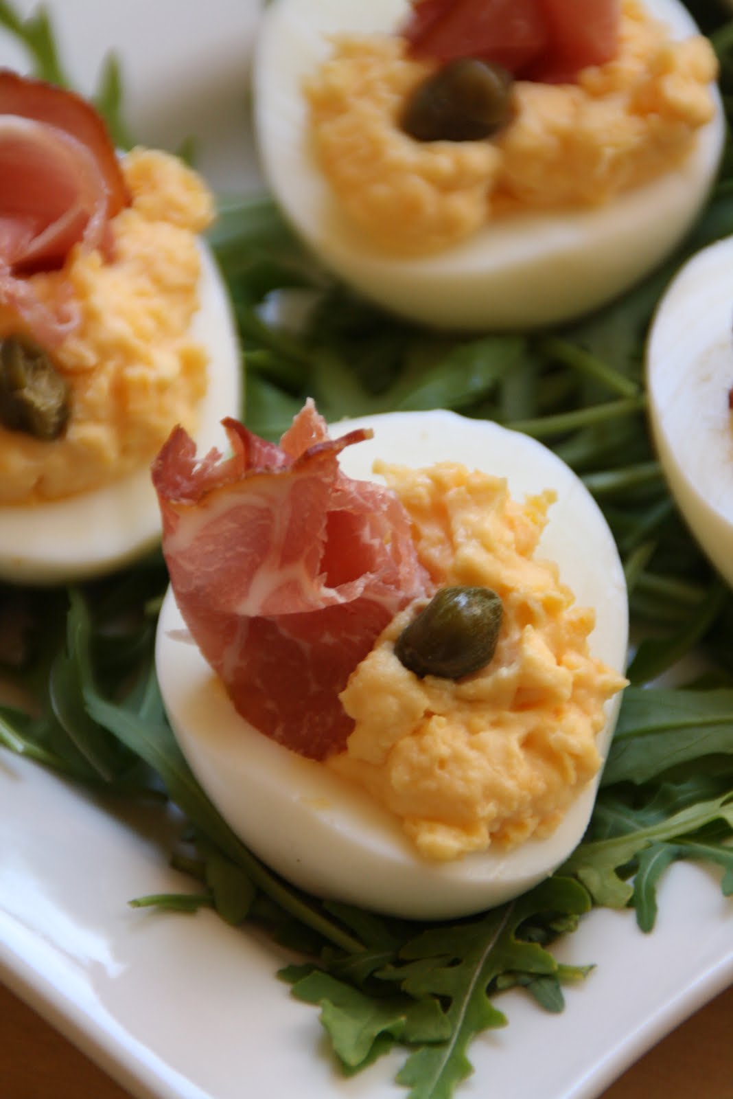 Jajka ugotować na twardo, przekroić i delikatnie wyjąć żółtka. W miseczce wymieszać żółtka z majonezem i świeżo mielonym pieprzem. Włożyć ponownie do jajek udekorować kaparami i zwiniętą w ruloniki szynką parmeńską.