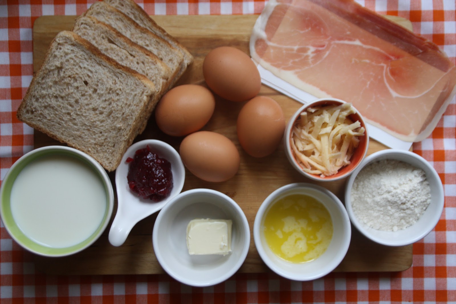 W małym rondelku robimy beszamel, czyli rozpuszczamy masło, dodajemy mąkę - energicznie mieszamy zasmażając mąkę, następnie dodajemy mleko i rozcieramy pozbywając się grudek, jeśli jest za gęsty dodajemy mleko, jeśli za płynny mąki. Odstawiamy. Chleb tostowy wałkujemy - brzmi dziwnie prawda? Ale serio, wałkujemy na cieńsze "placki". Każdy z nich umieszczamy w natłuszczonej kokilce. Na dno kładziemy plasterek szynki, żurawinę. Na to wbijamy jajko - jeśli jest większe lub kokilki niewielkie, odejmujemy nieco białka. Solimy i przykrywamy beszamelem, wierzch pokrywamy tartym serem. Wystające kawałki chleba smarujemy roztopionym masłem. Wstawiamy do piekarnika nagrzanego do 180 stopni na 10-12 minut.