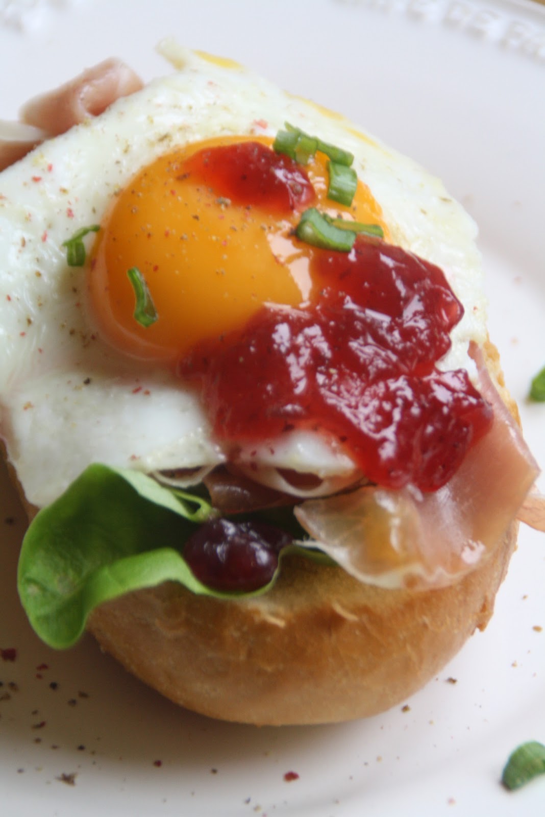 Jajko sadzone na grzance z szynką parmeńską i żurawiną