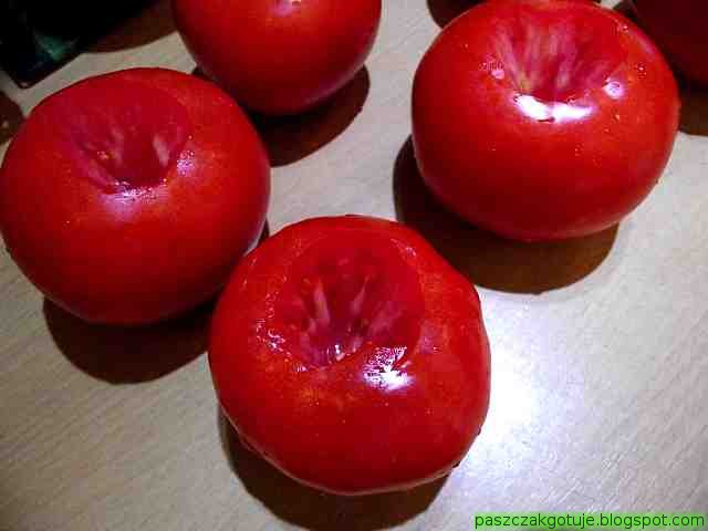 Pomidora naciąć na krzyż, zalać wrzątkiem, po 15 sekundach wyjąć pomidora i przełożyć do zimnej wody, teraz skórka będzie łatwo odchodziła.