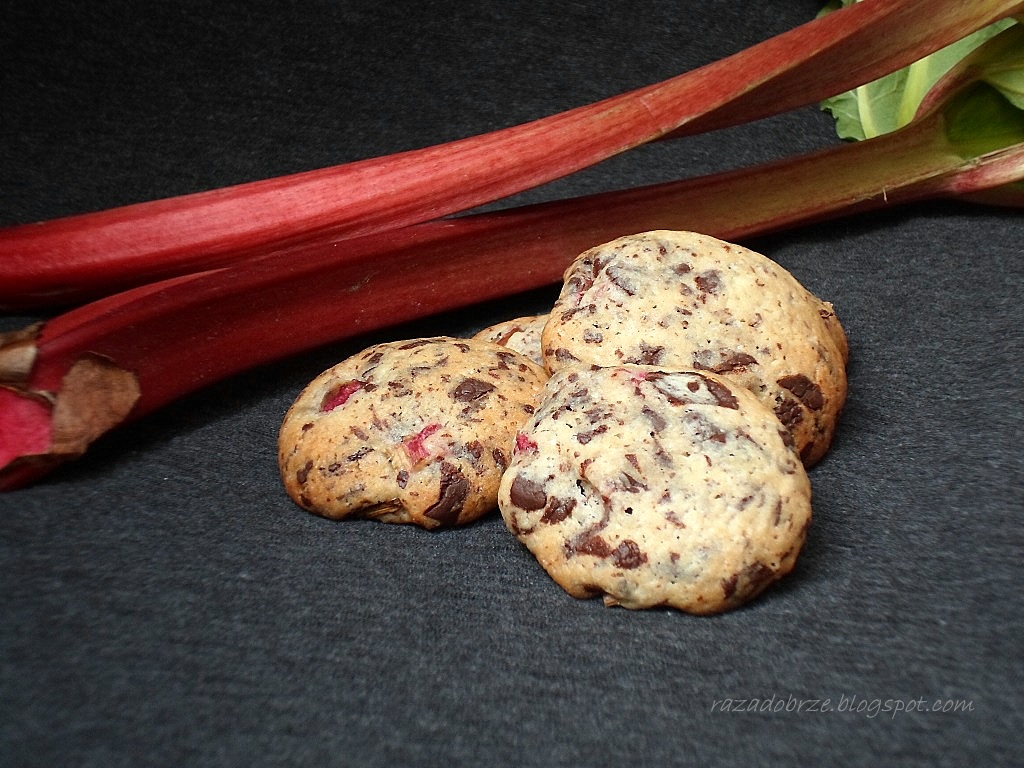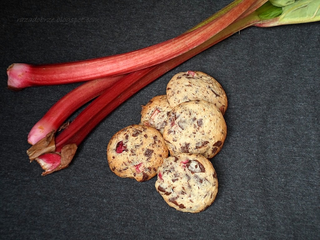 Dziś jednak napiszę o czymś, co przygotowałam kilka dni wcześniej. Miałam akurat taką smętną resztkę rabarbaru - została po tarcie, pokrojona w jakieś dziwne kawałki; szczerze mówiąc, nie myślałam, że nada się do czegokolwiek... Aż przypomniałam sobie o ciasteczkach, które widziałam na blogu Domowe wypieki. Prześliczne, zgrabne maleństwa, z niewielką ilością kwaśnych, rabarbarowych kawałeczków. Rewelacja! Przygotowuje się je dosyć szybko - u mnie czas się wydłużył przez chłodzenie ciasta, ale dzięki temu o wiele łatwiej je formować. Moje ciasteczka nie są tak idealnie okrągłe, ale smakują obłędnie! Połączenie kruchego ciasta, czekolady i rabarbaru jest wspaniałe, w dodatku można je sobie wziąć w łapkę tuż przed wyjściem z domu i rozkoszować się smakiem w drodze do pracy. Jeśli więc macie jakieś smętne resztki rabarbaru, zamiast wyrzucać, koniecznie zróbcie takie ciastka!