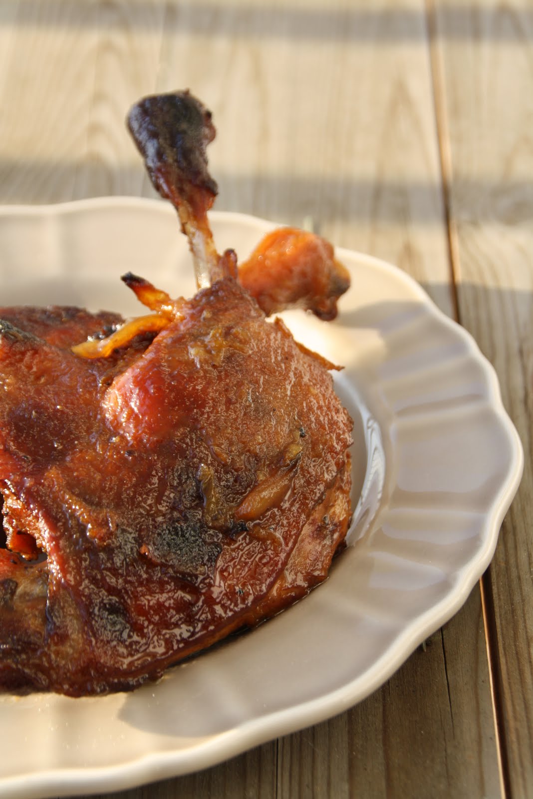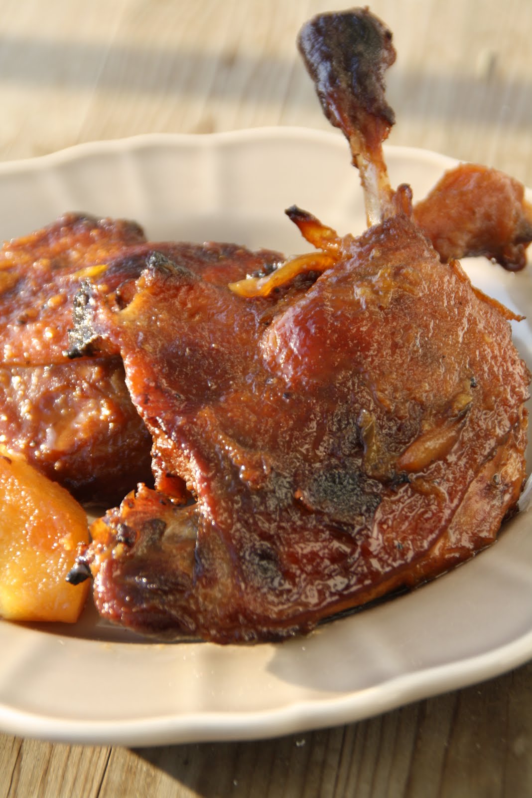 Na dnie formy do pieczenia ułożyć cebule pokrojone w piórka, obrany i pokrojony w plastry imbir oraz plastry sparzonych pomarańczy. Na tym ciasno ułożyć nóżki, polać marynatą wymieszaną z dodatkowym miodem, dopełnić plastrami cytryny i ewentualnie posypać tymiankiem. Wstawić do nagrzanego do 200 stopni piekarnika na około 2 godziny (zależy od wielkości nóżek). W połowie pieczenia odlać część płynu, bo przybywa tłuszczu wytopionego z kaczki. Kilka razy w czasie pieczenia odwracać udka, żeby piekły się równomiernie. Muszą być mięciutkie.