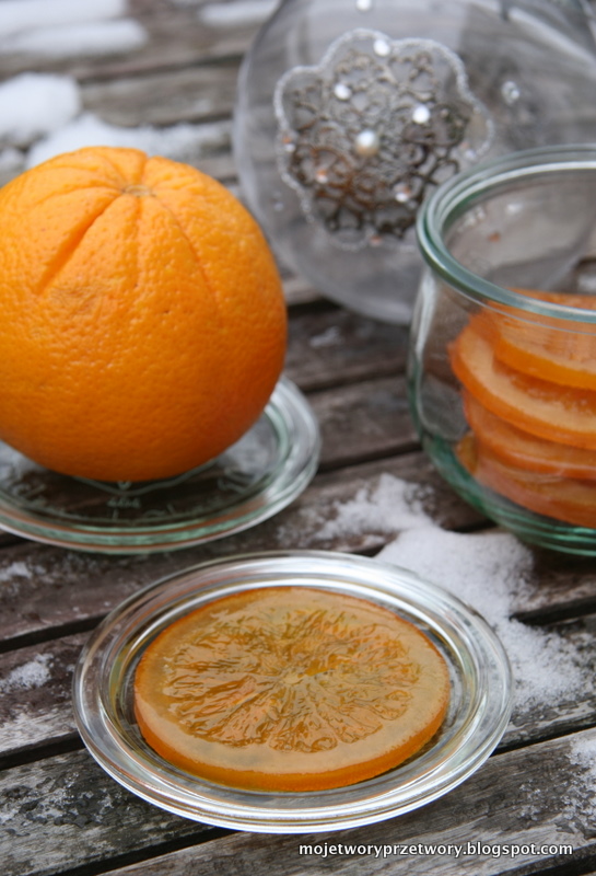 - pokroić na cienkie plasterki (ale bez tych z początku i końca pomarańczy, ma być miąższ) i wrzucić do gorącego syropu
