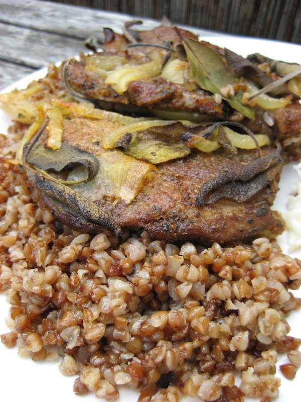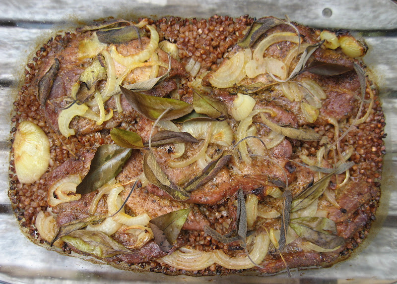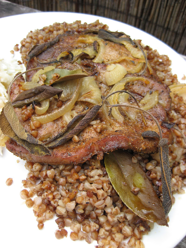 Karkówka i kasza gryczana zalana czerwonym winem w towarzystwie świeżych liści laurowych i szałwi