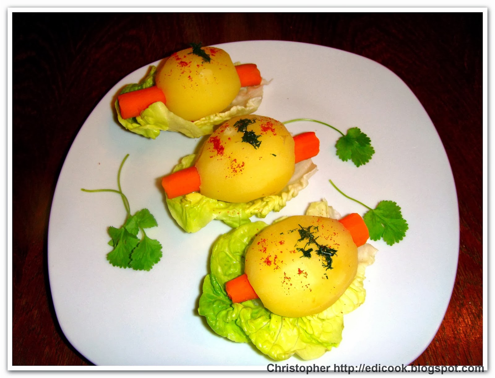 Za pomocą wycinaka gniazd nasiennych wydrążyć tunel w kartoflach i obrać je. Marchewki obrać i wsunąć w tunel. Warzywa ugotować w osolonej wodzie. Uważać ,żeby kartofli nie rozgotować. Wyjąć z wody ,ułożyć na sałacie i posypać ulubionym ziołem i przyprawą.