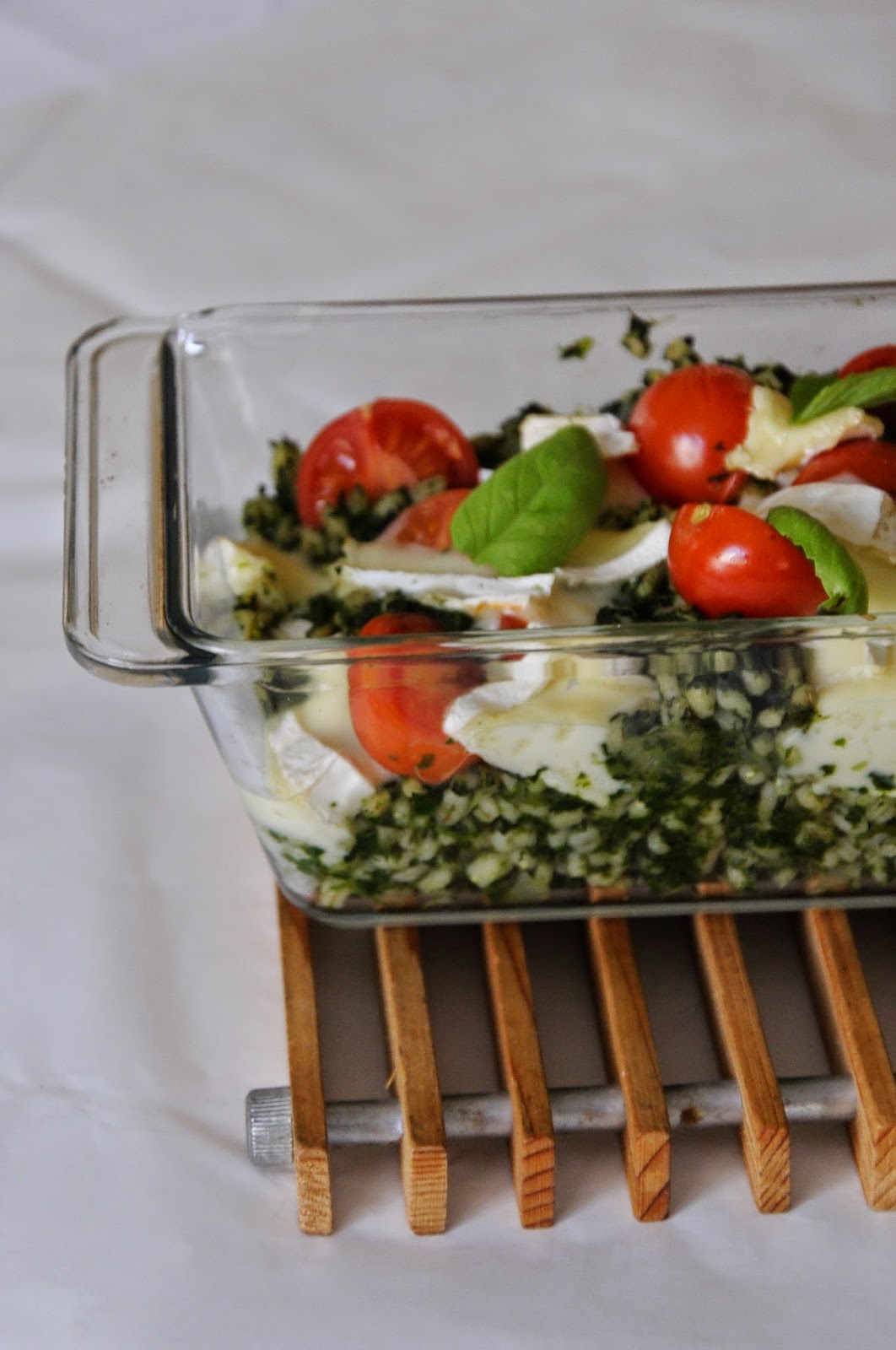 Kasza pęczak zapiekana ze szpinakiem, pomidorkami i camembertem