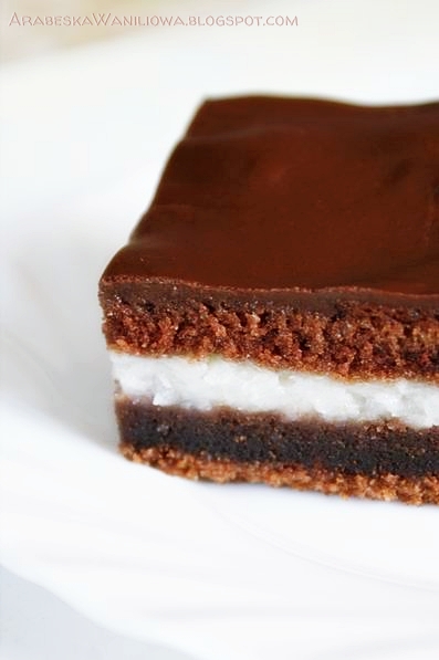 Witam po przerwie i zapraszam na ciasto z kokosem. Bardzo smaczne i sycące - jednym kawałkiem można zaspokoić swój apetyt na słodkości , pomimo , że ciasto samo w sobie nie jest aż tak bardzo słodkie. Nie jestem tylko pewna co do jednej rzeczy.. U mnie na dole ciasto wyszło bardziej jak 'brownie' (złośliwi powiedzą "zakalec") , a na górze biszkoptowe. Zdjęcie oryginału nie jest zbyt wyraźne , ale wydaje mi się , że całość ma być jednak taka , jak dolna warstwa (z taką ilością oleju nawet nie spodziewałam się puszystości , tylko , że chyba przedobrzyłam z ubijaniem ;-) Przepis pochodzi z tej strony.