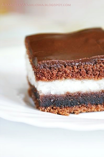 Połowę ciasta wlać do natłuszczonej blaszki (23 x 23 cm) i piec wstępnie 10-15 minut w temp. 180 st.C. Od razu na wierzchu rozsmarować masę kokosową , a potem wlać resztę ciasta kakaowego. Piec jeszcze 30 minut - do suchego patyczka.