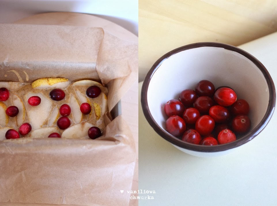 Masło rozpuść w garnuszku, ostudź. Mąkę przesiej do miski, dodaj proszek do pieczenia, cukier, zmielone migdały i przyprawy. W osobnej misce wymieszaj jajka, ekstrakt, mleko,miód, rozpuszczone i ostudzone masło. Zmiksuj zawartość obu misek. Formę keksową o wymiarach 30x 11 cm wyłóż papierem do pieczenia i przełóż do niej masę. Gruszki obierz i poukładaj na cieście wraz z żurawiną.