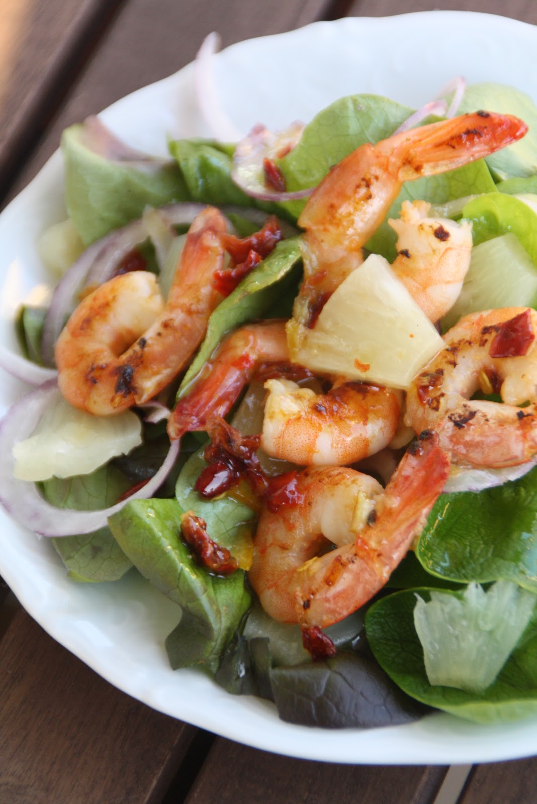 Krewetki - kupiłam obgotowane - rozmroziłam, opłukałam i osuszyłam. Wymieszałam sos chilli z sokiem z cytryny i zamarynowałam krewetki - około 30 minut. Wrzuciłam je następnie na patelnię i podsmażyłam. Cebulkę obrałam i pokroiłam na cieniuteńkie krążki. Ananasa odsączyłam i pokroiłam na kawałki. Na talerzykach ułożyłam sałatę, trochę ananasa, cebulkę i krewetki. Polałam dresingiem.