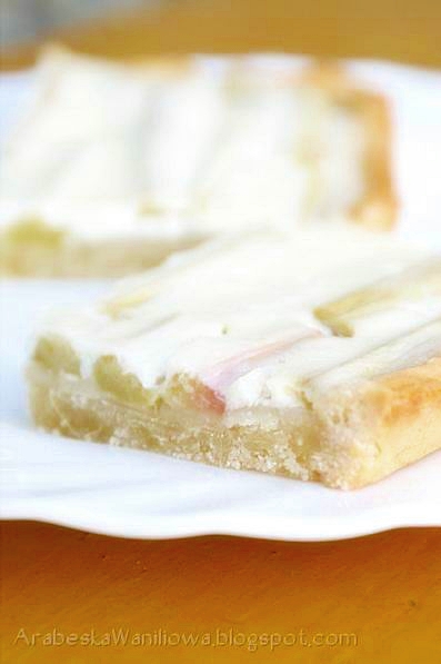 Większość z Was zapewne rozpoczęła już sezon truskawkowy , a ja ciągle "wałkuję" rabarbar. Wpis jest co prawda mocno spóźniony , ale truskawki dopiero zaczynają u mnie dojrzewać. A wracając do rabarbaru. Wypróbowałam już kilka przepisów z jego dodatkiem , jednak w takiej wersji dopiero pierwszy raz. Ogólnie ciasto smaczne , takie śmietankowe , słodko-kwaśne , tylko ten kruchy spód wolałabym jednak delikatniejszy (z tego też powodu nie przepadam za mazurkami). Na przepis natknęłam się na tym blogu i skorzystałam z niego zachęcona smakowitymi fotkami.