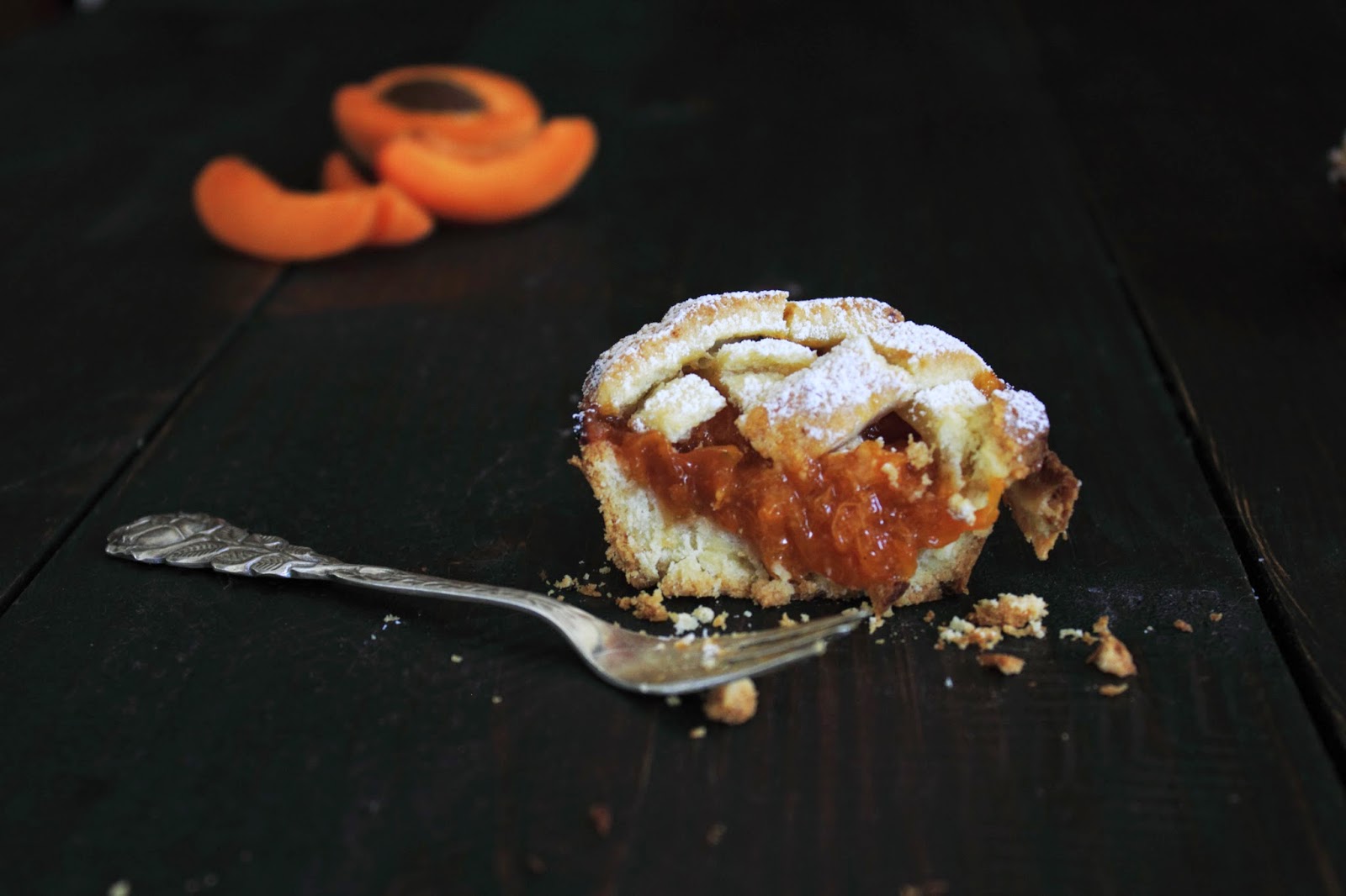 Kiedy babeczki się upieką, wyjmujemy je z piekarnika i nakładamy do nich morelowe nadzienie. Następnie robimy na wierzchu każdej babeczki kratkę z pasków ciasta. Pieczemy w 180 stopniach, aż kratka się wyraźnie zezłoci (10-15 minut). Wyjmujemy i odstawiamy do wystygnięcia.