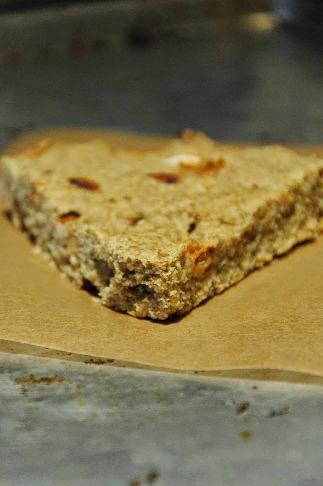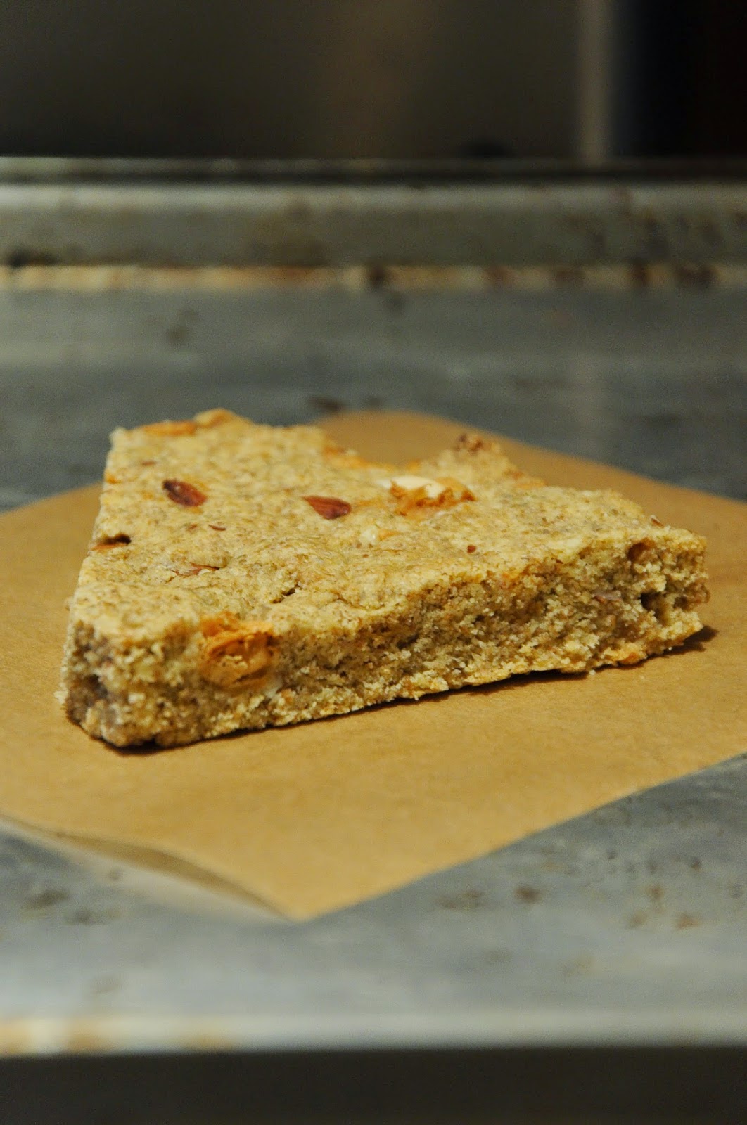 Utrzeć dokładnie miękkie masło z jajkiem. Wsypać odstawione suche składniki. Mieszać/ ucierać do otrzymania jednolitego ciasta. Wsypać posiekane lekko migdały i małe kawałeczki czekolady. Wymieszać. Przełożyć do wyłożonej papierem do pieczenia tortownicy. Piec w piekarniku nagrzanym do 190 stopni przez około 25 minut (wierzch musi być delikatnie zarumieniony i wyraźnie upieczony). Ciasto wyjąć i odstawić do całkowitego ostudzenia.Smacznego!
