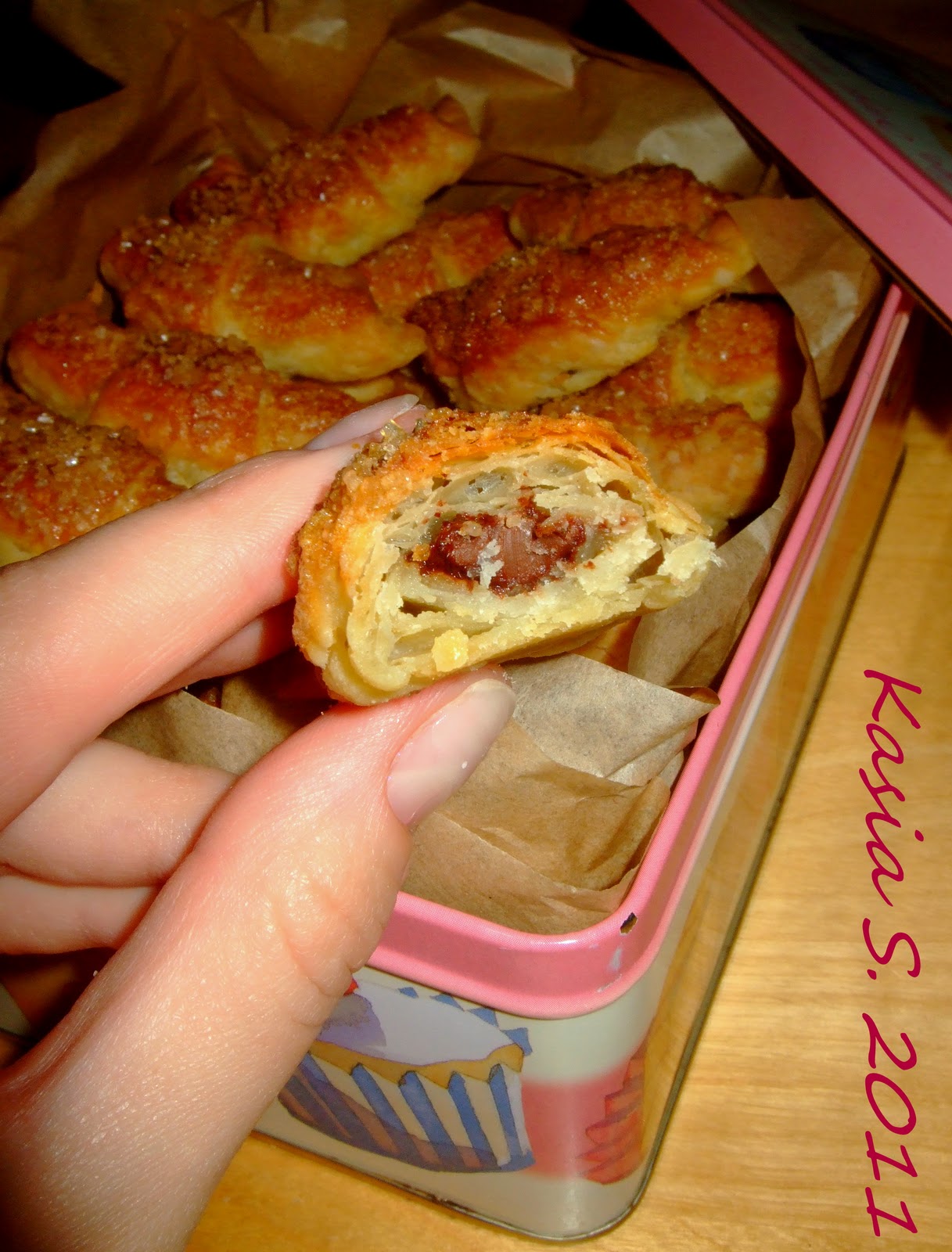 Do tych przepysznych rogalików mam szczególny sentyment. Były one jednym z pierwszych (jak nie pierwszym) słodkich wypieków, które popełniłam po wyjeździe do UK. Oznacza to też były też jednym z pierwszych w moim życiu.Kruche ciasto, strukturą przypominające francuskie, mocno maślane, skrywające w sobie słodkie nadzienie z marmolady lub czekolady umilało mi moje wczorajsze imieniny.Idealne w duecie z filiżanką aromatycznej kawy:)Kruche rogaliki z ciasta twarogowo-maślanego (ok 50 sztuk):