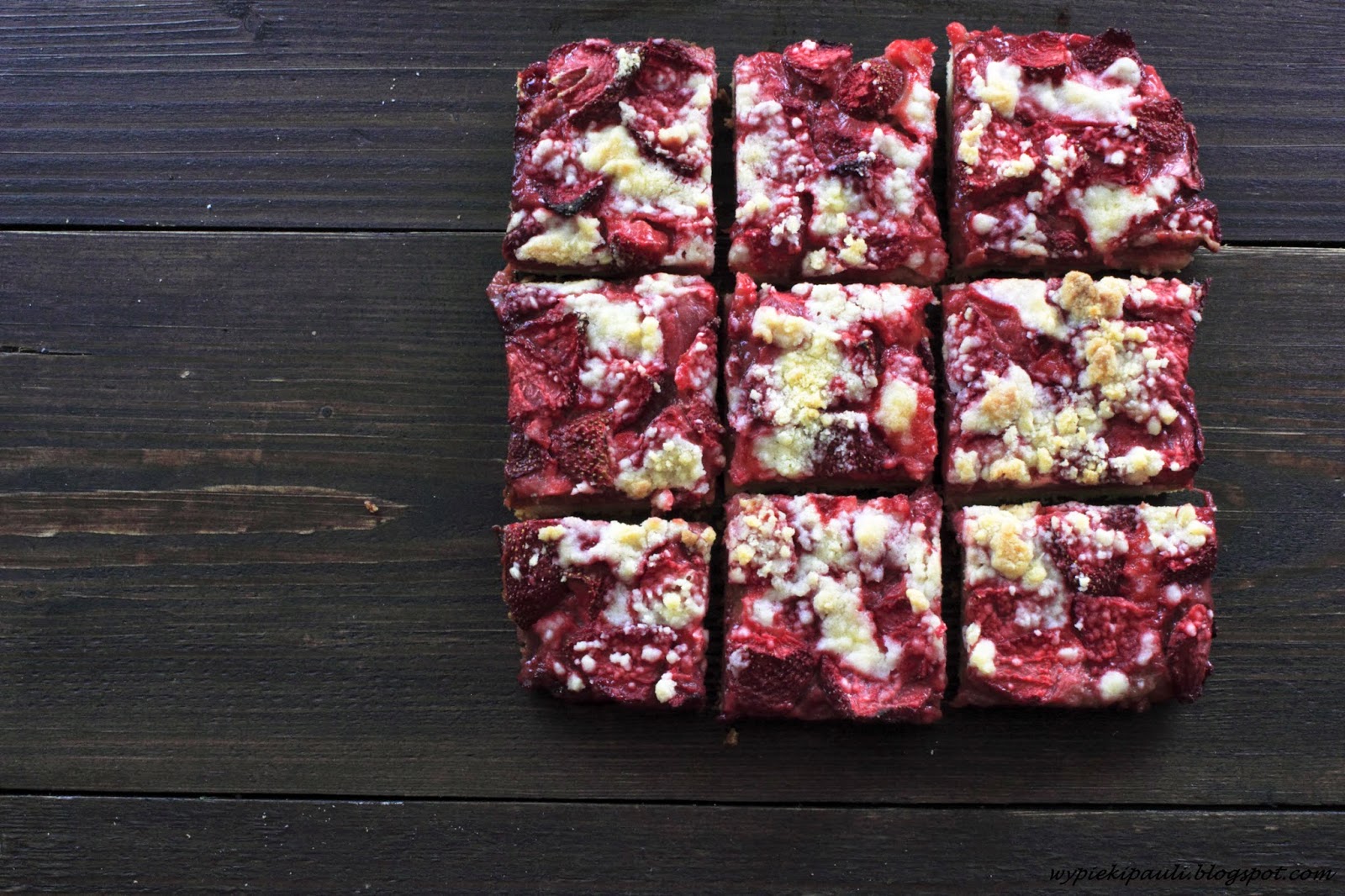 Na podpieczony spód wykładamy rabarbar, truskawki i posypujemy kruszonką. Pieczemy ok. 50-60 minut w 190 stopniach. Odstawiamy do ostygnięcia.