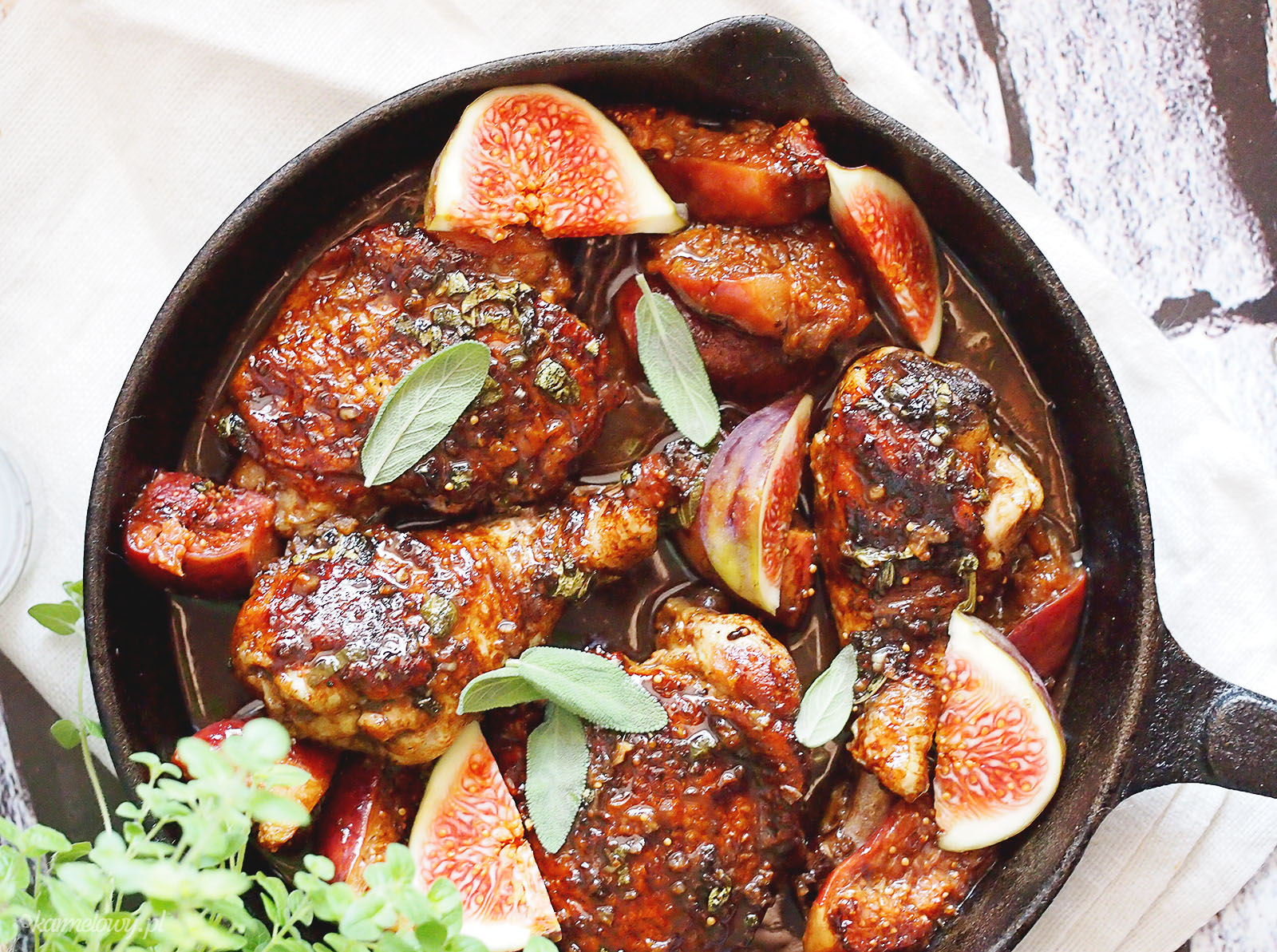 - Flip the chicken thighs and scatter the figs around them. Carefully pour the glaze evenly over the chicken and figs. Transfer the skillet to the oven and cook, spooning some of the glaze in the skillet back over the chicken halfway through, bake 10 to 12 minutes total.