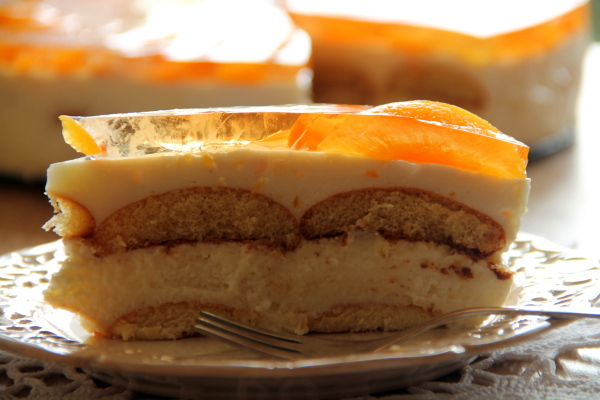 Gdy masa jogurtowa stężeje, ułóż na niej kawałki brzoskwiń z puszki i zalej tężejącą galeratką.