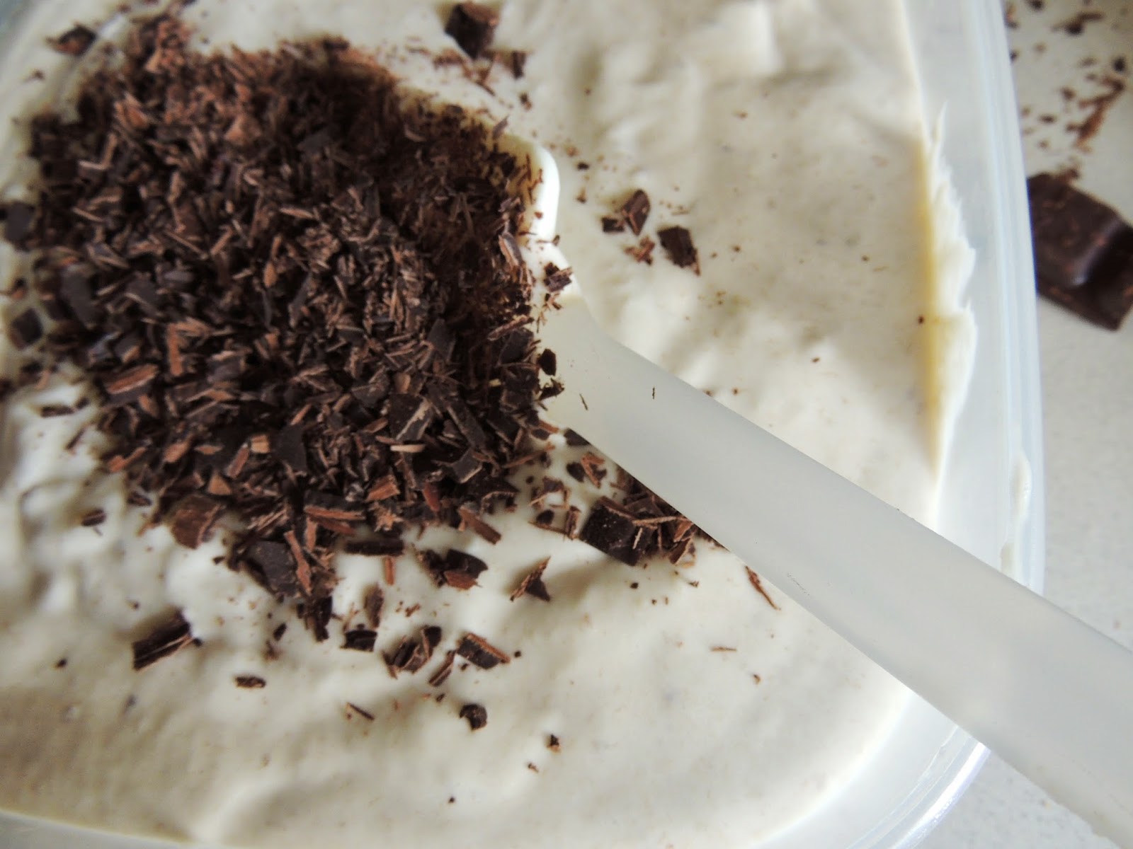 Jak zrobić domowe lody? Śmietankę ubić ze szczyptą soli. Czekoladę ustawic pionowo na desce i ostrym nożem skrawać wiórki. Co jakiś czas odwracać tabliczkę o 180 stopni, zeby ułatwić sobie zadanie.