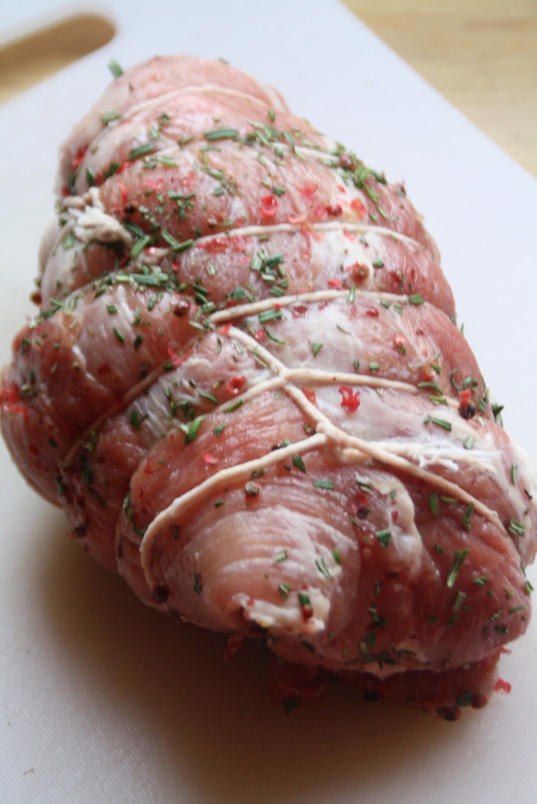 Rozmaryn posiekać, pieprz rozgnieść np dnem garnka, wymieszać z solą i natrzeć mięso. Przełożyć mięso do dużej brytfanny (na tyle dużej żeby zmieściły się też wszystkie dodatki) i wstawić do piekarnika nagrzanego do 150 stopni. W między czasie obrać i pokroić ziemniaki, marchewkę i pietruszkę, włożyć do miski z wodą. Gruszki obrać i pokroić na ćwiartki, włożyć do wody z sokiem z cytryny żeby nie ciemniały. Cebulę obrać i pokroić na ćwiartki. Po 4h dodać do mięsa ziemniaki - polać olejem, po kolejnej godzinie (5h od początku pieczenia) dodać marchewkę, pietruszkę, cebule i całe ząbki czosnku. Po 5,5h godziny od początku pieczenia dodać gruszki. Kiedy dobiegnie końca 6h pieczenia danie jest gotowe. Skórka jest chrupiąca a mięso w środku aksamitne, soczyste i kruche.