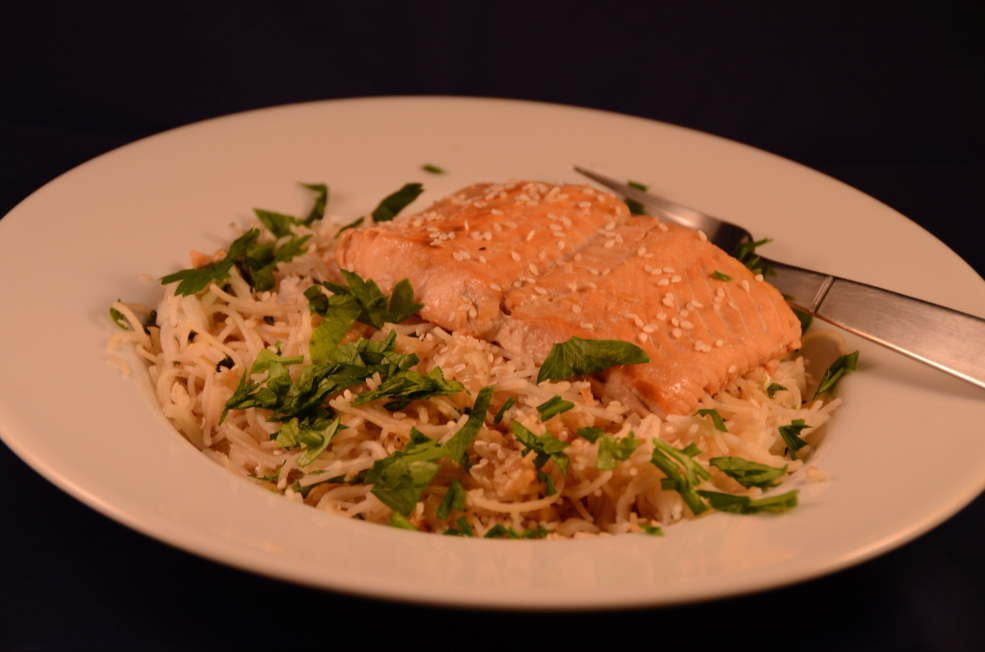 Łosoś teriyaki z sezamem i kolendrą na makaronie ryżowym
