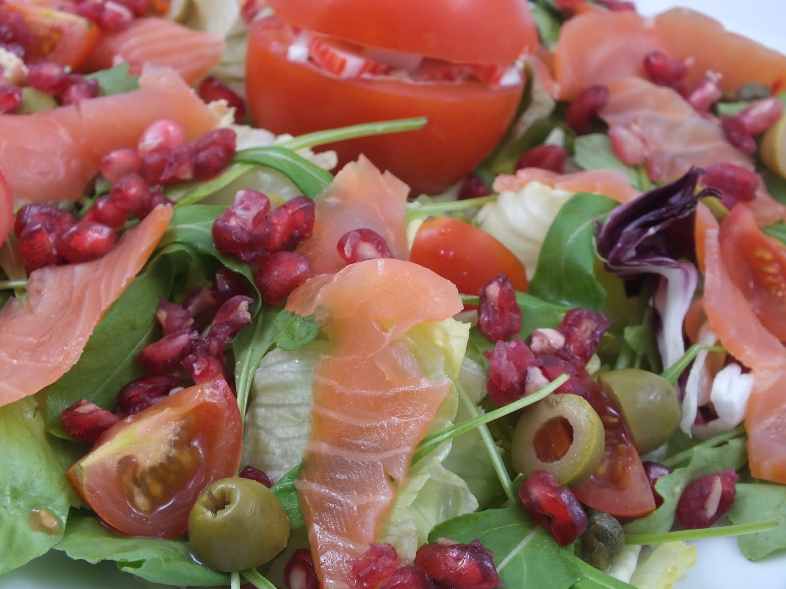 Szybka i wykwintna sałatka na lekką kolację lub lunch. Granat i łosoś wędzony idealnie ze sobą współgrają…