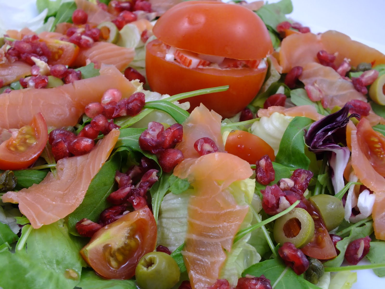 Łosoś wędzony na sałacie z dressingiem z granatu