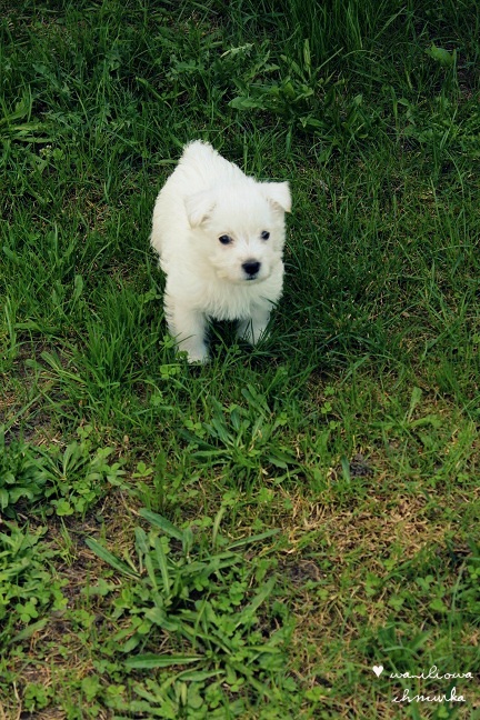 Dziś przeszliśmy się z Willem na łąkę. Kicał jak biały zając, napotykając co chwila jakąś stokrotkę czy inny kwiatek międlił je w mordce zadowolony, że w ogóle istnieją. To jego pierwszy raz, wybaczyłam mu więc to marnotrawstwo! Swoją drogą zastanawia mnie, dlaczego akurat kwiatki? To chyba pierwszy pies jakiego znam, który z takim zapałem i radością zrywa i zjada stokrotki, bratki, fiołki i inne najładniejsze oznaki wiosny.