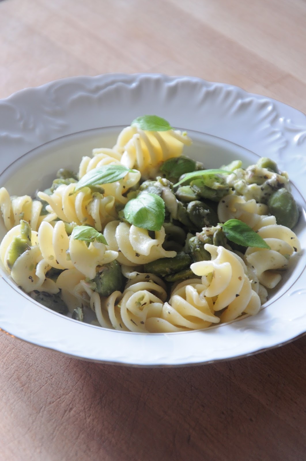Do tak przygotowanego bobu wrzucić makaron oraz dodać starkowany ser. Wszystko dokładnie wymieszać. Wyłożyć na talerze i posypać listkami bazylii. Smacznego!