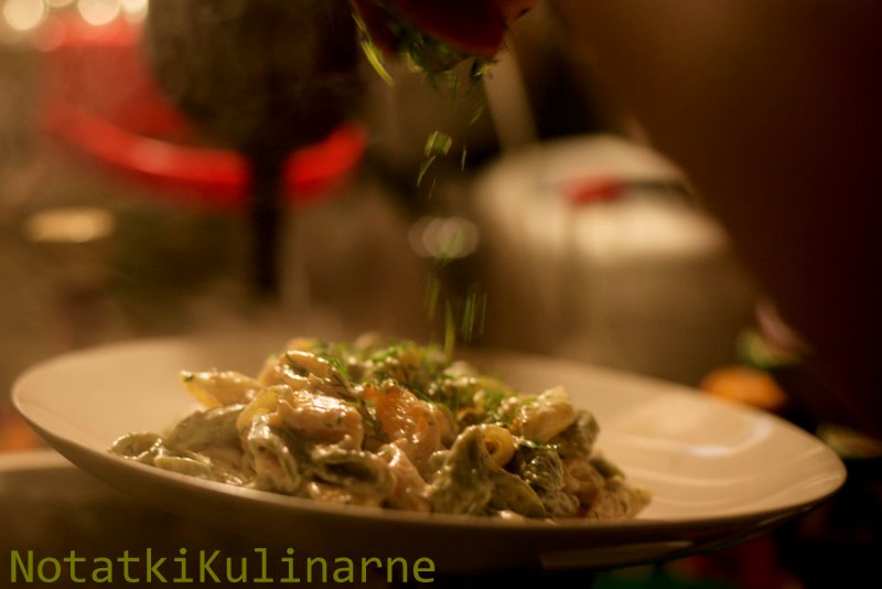 Makaron ugotować, odcedzić, trzymać w cieple. Łososia rozdrobnić, oliwę rozgrzać, wrzucić łososia, podgrzać, dodać mascarpone i śmietankę, podgrzać, doprawić pieprzem i koperkiem, wymieszać z makaronem - i już.