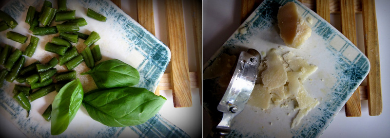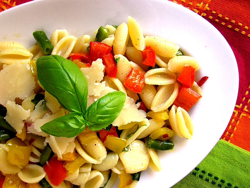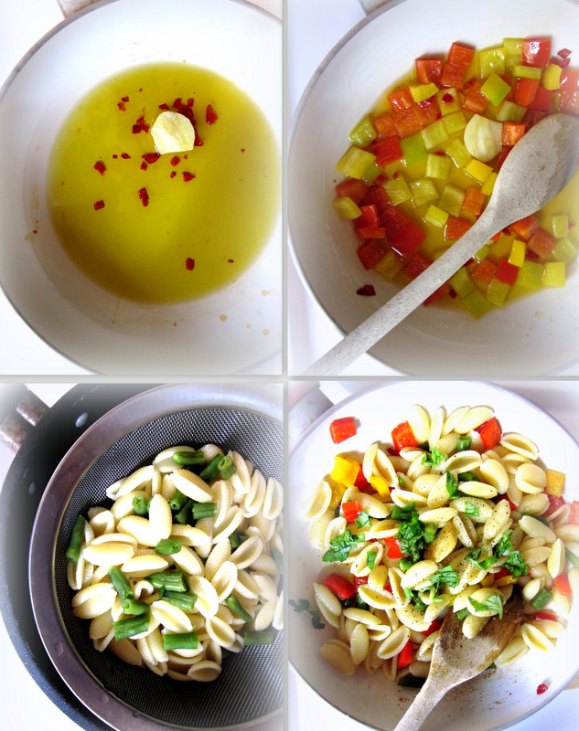 Wykonanie: -Nastawić wodę na makaron. -Paprykę umyć, osuszyć , usunąć gniazda nasienne i pokroić w kostkę. -Na głębokiej patelni rozgrzać oliwę , dodać papryczkę, czosnek i mieszając smażyć ok.2-3 minuty /nie przypalić/ , po czym czosnek usunąć. -Dodać pokrojoną paprykę, chwilkę podsmażyć , doprawić do smaku , po czym zmniejszyć ogień , przykryć pokrywką i dusić do miękkości ok.10 min. Jeśli wymaga podlać odrobiną wody /z gotującego się makaronu/. -W międzyczasie umyć i obrać fasolkę szparagową, pokroić na mniejsze kawałki. -Do gotującej się , osolonej wody wrzucić makaron wraz z pokrojoną fasolką i gotować ok.10-15 min. od chwili zagotowania się wody. -Ugotowany makaron z fasolką przecedzić i wsypać na patelnię z papryką. -Starannie połączyć składniki i mieszając podgrzewać ok. 1 minutę, aż makaron przejdzie smakiem warzyw /można dodać odrobinę wody z makaronu/. -Dodać kilka listków bazylii , połowę sera /startego lub pokrojonego w cieniutkie płatki/, doprawić do smaku solą i pieprzem, wymieszać. -Gotowy makaron przełożyć na talerze, posypać płatkami sera, ozdobić świeżą bazylią.