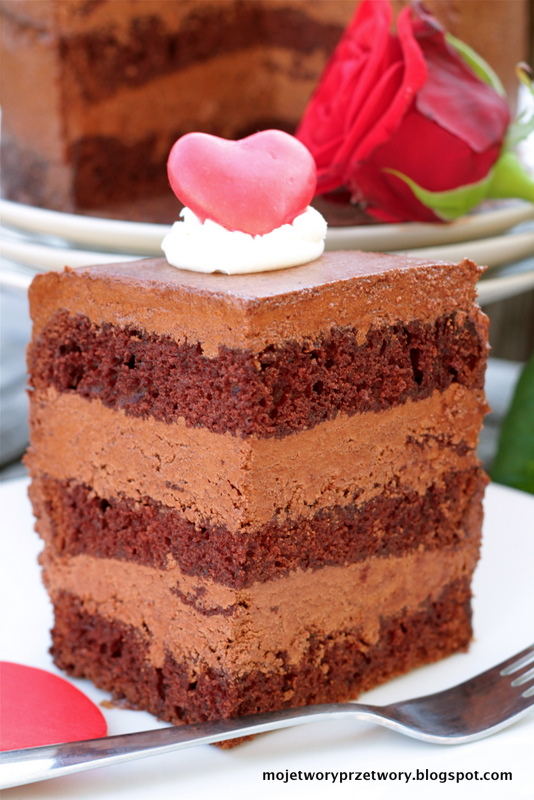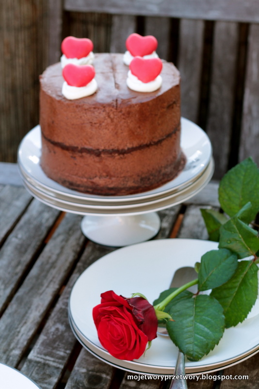 - przełożony tort schładzamy w lodówce najlepiej przez całą noc, podajemy w towarzystie bitej śmietany i wisienki koktajlowej (ja z racji naszej rocznicy dałam cukrowe serucha)