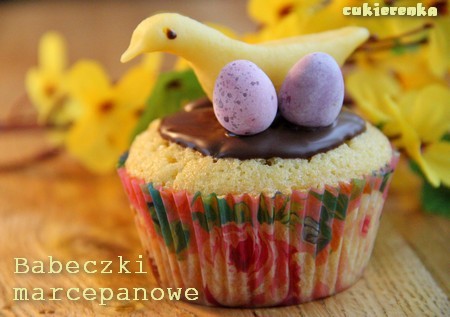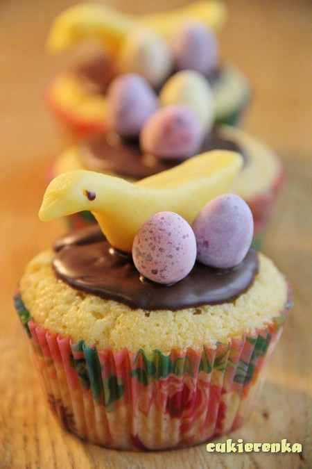 Udekoruj. Rozpuść w mikrofalówce lub w kąpieli wodnej czekoladę i oblej wierzch każdej babeczki. Kiedy czekolada będzie już lekko zastygać przyklej dekoracje. Moje kaczuszko- kurczaczko-gołąbki powstały z marcepanu a czekoladowe jajeczka kupiłam gotowe. Na babeczki można również położyć maślany krem np z tego przepisu . Smacznego !