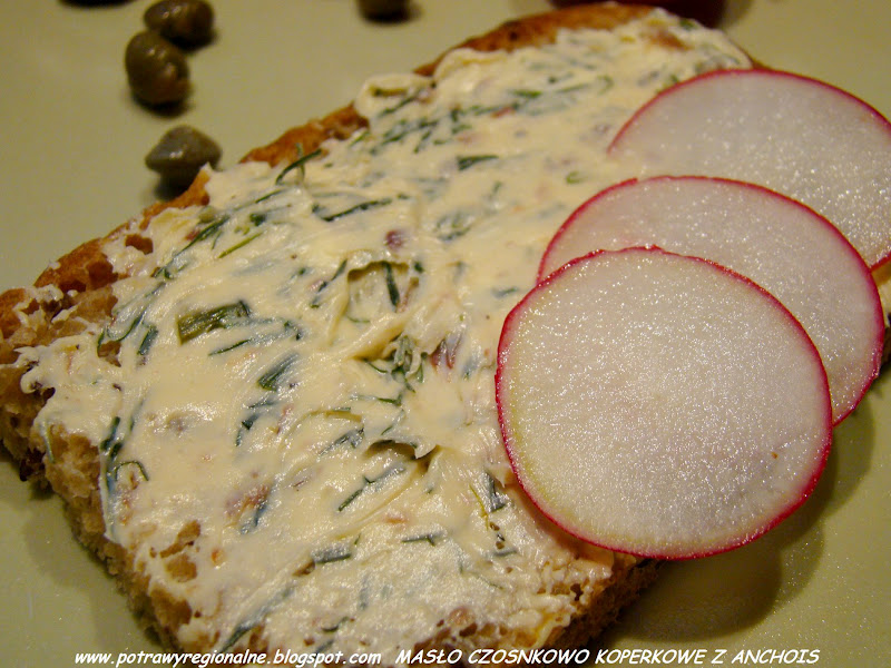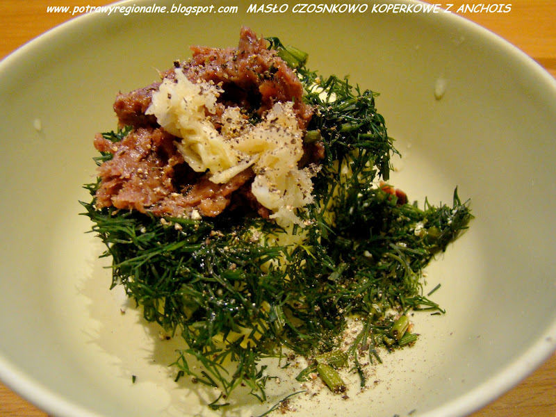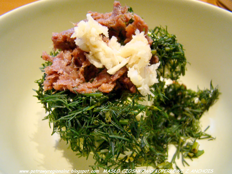 Pyszne masło czosnkowe ze świeżym koperkiem. Idealne do świeżego chlebka, grzanek lub warzyw np.szparagów. Do tego fileciki anchois i ząbek czosnku.Pycha! Zapewniam,że zjecie z tym pysznym masełkiem od razu całą bagietkę ;-)