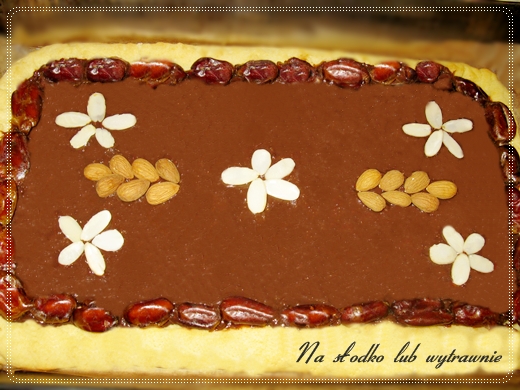 Z podanych składników zagnieść jednolite ciasto a następnie zawinąć w folię i włożyć na dwie godziny do lodówki, żeby się schłodziło. Schłodzone ciasto rozwałkować na wielkość blachy. Blachę wyłożyć papierem do pieczenia, położyć rozwałkowane ciasto. Brzegi ciasta zaokrąglić tak aby były wyższe niż reszta ciasta ( żeby polewa nie uciekła).