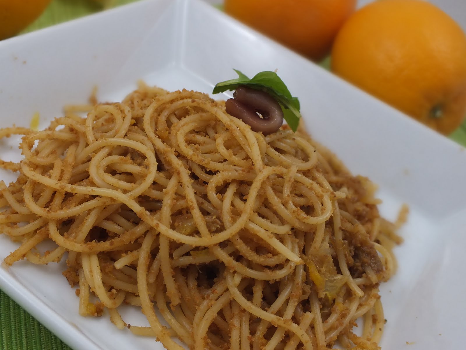 Spaghetti all’arancia con acciughe - muszę przyznać, że miałam wątpliwości co do tej potrawy. Były dwie opcje: będzie wspaniała i aromatyczna albo okropna i niemożliwa do zjedzenia. Rezultat był bardzo pozytywny.Połączenie smaków niecodzienne, ale wszystko razem dobrze się komponowało. Jedynie dla mnie za dużo było bułki tartej. Natępnym razem zmniejszymy ilość. Polecam gorąco to orginalne spaghetii!
