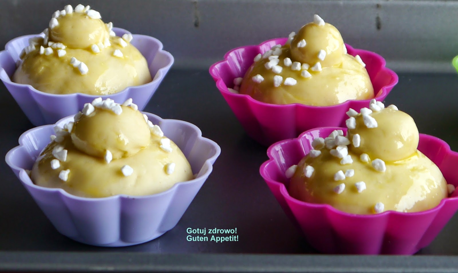 - Wszytkie brioszki posmarować rozbełtanym jajkiem z mlekiem i posypać cukrem. Po upieczeniu będą śliczne, rumiane.