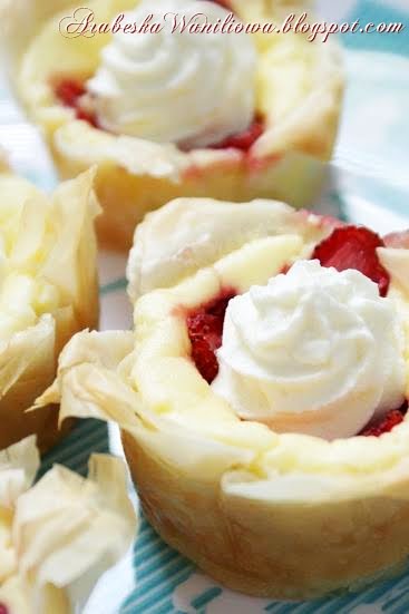 To już czwarty wypiek z ciastem fillo i jeszcze nie mogę go skończyć (wciąż zostało kilka arkuszy do wykorzystania). Zainspirowana poniekąd sernikiem z chałwą , postanowiłam zrobić takie oto mini-serniczki. Lekkie serowo-owocowe w chrupiących gniazdkach z ciasta fillo. Po wystygnięciu zrobiły się w nich na środku dołki , które aż się prosiły , żeby napełnić je bitą śmietaną - pycha ! :-)