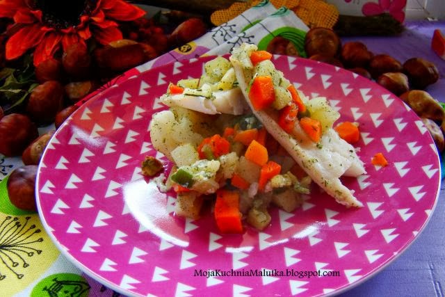 Rybka zapiekana z warzywami z piekarnika. Lekkie smaczne danie z nutka pikanterii od papryczki chilli.