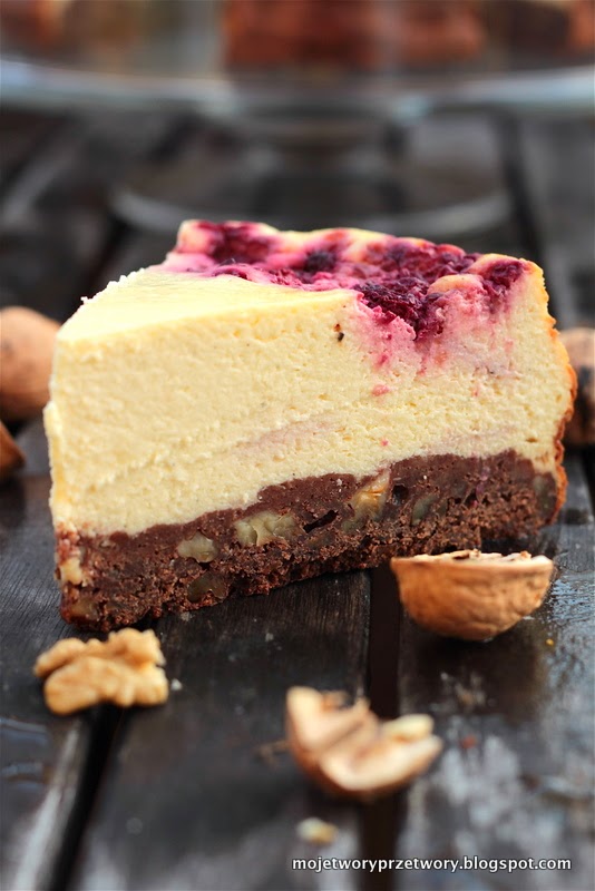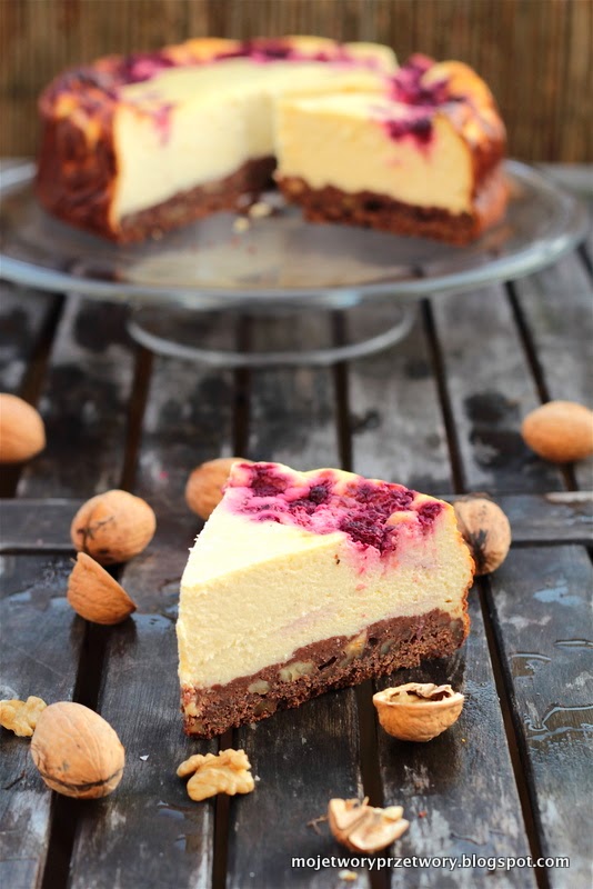 Ale już nie marudzę, tylko przechodzę do meritum: sernik - bo uwielbiamy serniki orzechy - bo mam ich dużo, kakaowy spód - bo dlaczego nie :)? i miód!!! Oraz maliny - połączenie idealne!