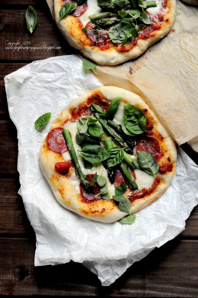 Wiosenne mini - pizze z mozzarellą, salami i szparagami. /z podanego przepisu wychodzą 4 niewielkie pizze na średnio grubym cieście/