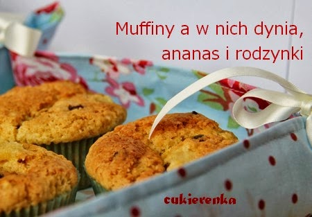 Kolejne muffiny z dynią. Tym razem tartą a nie z dyniowym pure, które najczęściej pojawia się w przepisach. Dodatkowo, oprócz dyni, w babeczkach można znaleźć kawałki ananasa i rodzynki. Muffinki były bardzo smaczne, niezwykle słodkie, mocno wilgotne z lekko spieczonym wierzchem. Smakowały. Ich wadą było to że się rozpadały i trzeba było je jeść widelczykiem. Moim zdaniem ciekawy dodatek do popołudniowej kawki/herbatki.