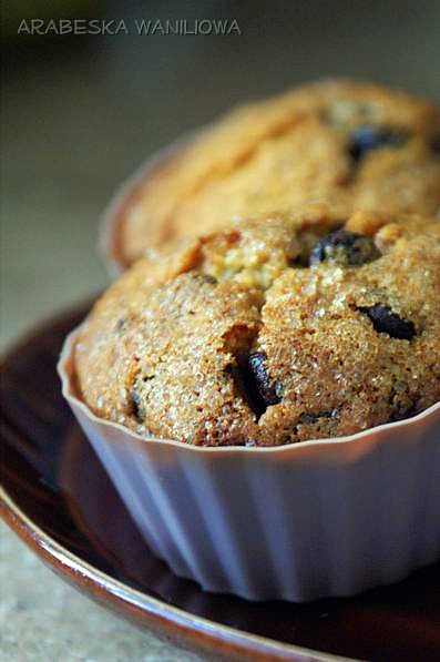 Dzięki temu , kto wymyślił muffiny :-) Robi się je ekspresowo i jest tyle różnych przepisów na nie , że można zadowolić każdego. Jest tylko jedna zasada , zawsze ta sama - oddzielnie miesza się suche składniki , a mokre oddzielnie , potem wszystko łączy się w całość pamiętając o tym , żeby nie przedobrzyć (czyli nie wymieszać ciasta zbyt dokładnie). Podawałam już przepis na muffiny z groszkami czekoladowymi , ale zupełnie inny (choć równie dobry). Tutaj na przykład , nie dodaje się cukru - zastępuje go syrop kukurydziany. Ja co prawda posypałam trochę po wierzchu brązowym cukrem , bo ciasto wydało mi się mało słodkie , ale jak się później okazało , czekolada zrównoważyła ten niedobór słodyczy ;-) Poza tym użyłam ciemnego syropu , bo taki akurat miałam , a w przepisie nie było zaznaczone jaki ma być , ale w oryginale babeczki są bardzo jasne w środku. Zresztą , mniejsza o kolor , bo muffiny wyszły pyszne ! - wszystkie zniknęły jednego dnia :-)