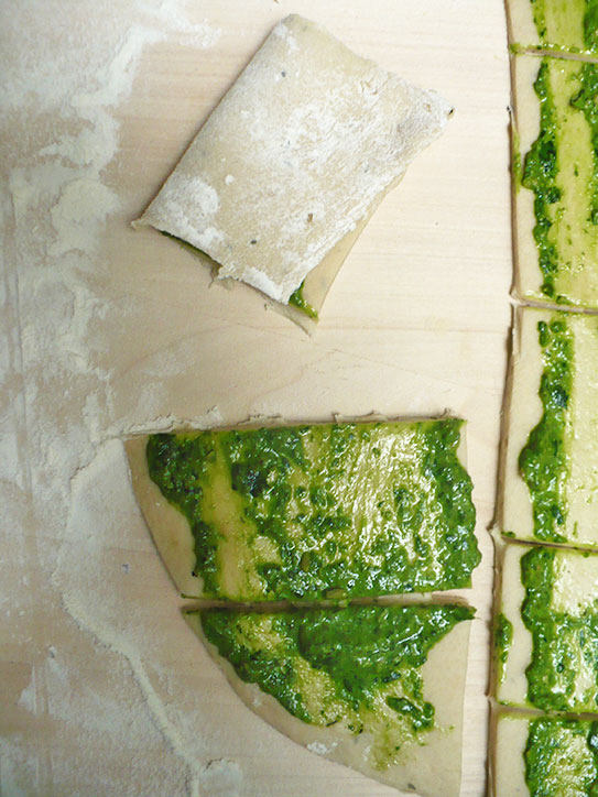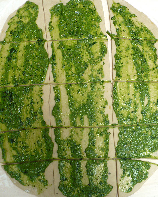 - Wyrośnięte ciasto wałkujemy na duży placek o wymiarach 30×40 cm. Dzielimy go na 3 grubsze paski, które smarujemy pesto. Paski dzielimy na prostokąciki i na mniejsze kawałeczki (widoczne na zdjęciu). Każdy paseczek składamy na pół, tworząc „kanapkę” lub „pierogi”.