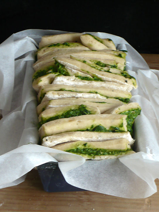 - Formę keksówkę smarujemy tłuszczem (np. oliwą) i wykładamy pergaminem. Układamy ciasno w formie przygotowane kawałki ciasta (widoczne na zdjęciu), zajmując w ten sposób całą keksówkę. Formę przykrywamy ściereczką i stawiamy w ciepłym miejscu na 30 minut.