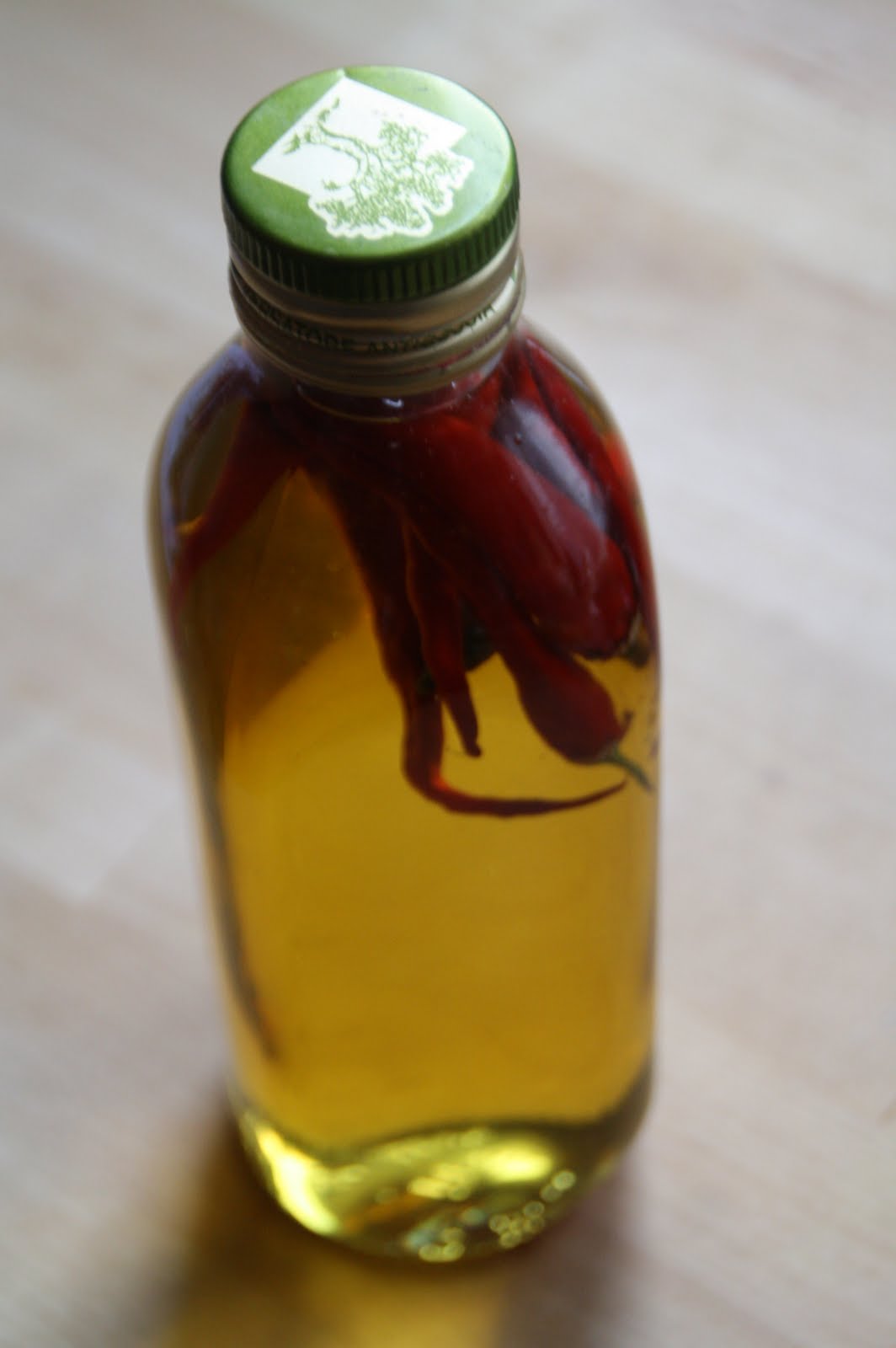 Oliwy smakowe są dosyć drogie, niestety. Ale przecież możemy robić własne, wg gustu. Hodowałam w tym roku na balkonie ostre małe papryczki. Część zjedliśmy jako dodatki do potraw a część dojrzewała maksymalnie na krzaczku. Wykorzystałam je właśnie do oliwy smakowej. Wrzuciłam do butelki, zalałam oliwą, zakręciłam szczelnie i uzbroiłam się w cierpliwość aby nie otwierać póki nie nabierze odpowiedniego papryczkowego aromatu.