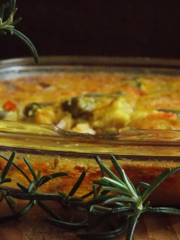 Masę przelać do żaroodpornego /niskiego lekko nasmarowanego oliwą/ naczynia i wstawić do nagrzanego piekarnika /180 st.C/ na ok. 25 minut. Masa powinna być ścięta ,a wierzch pokryty chrupiącą skórką.
